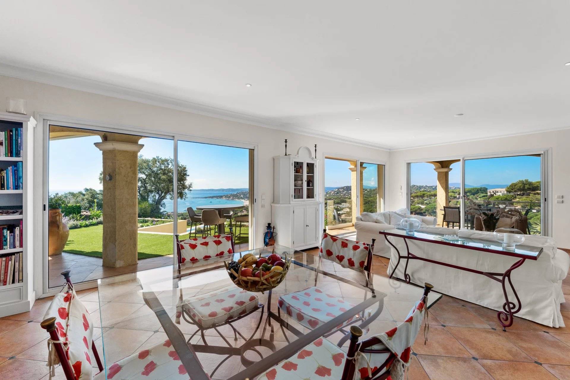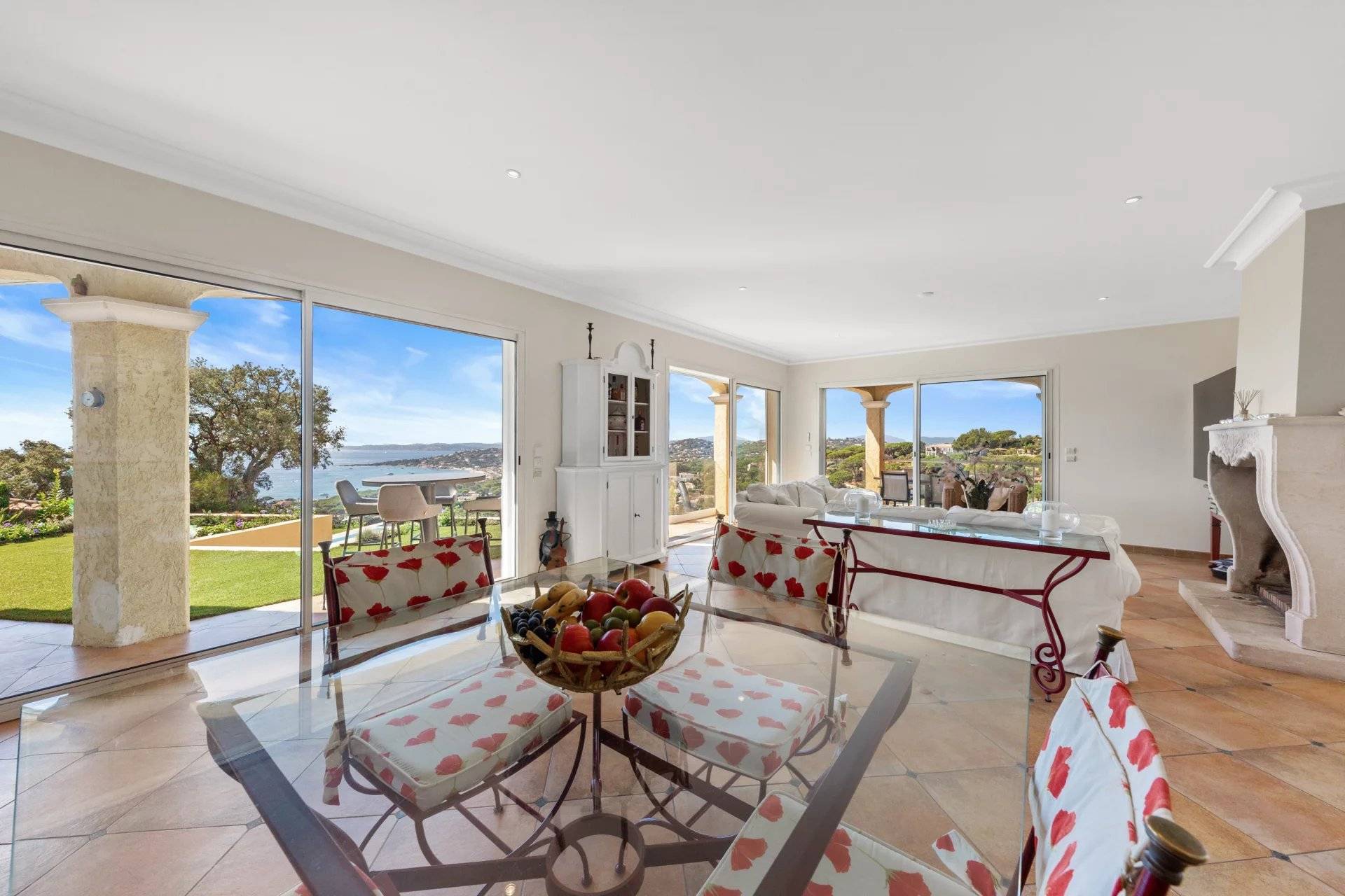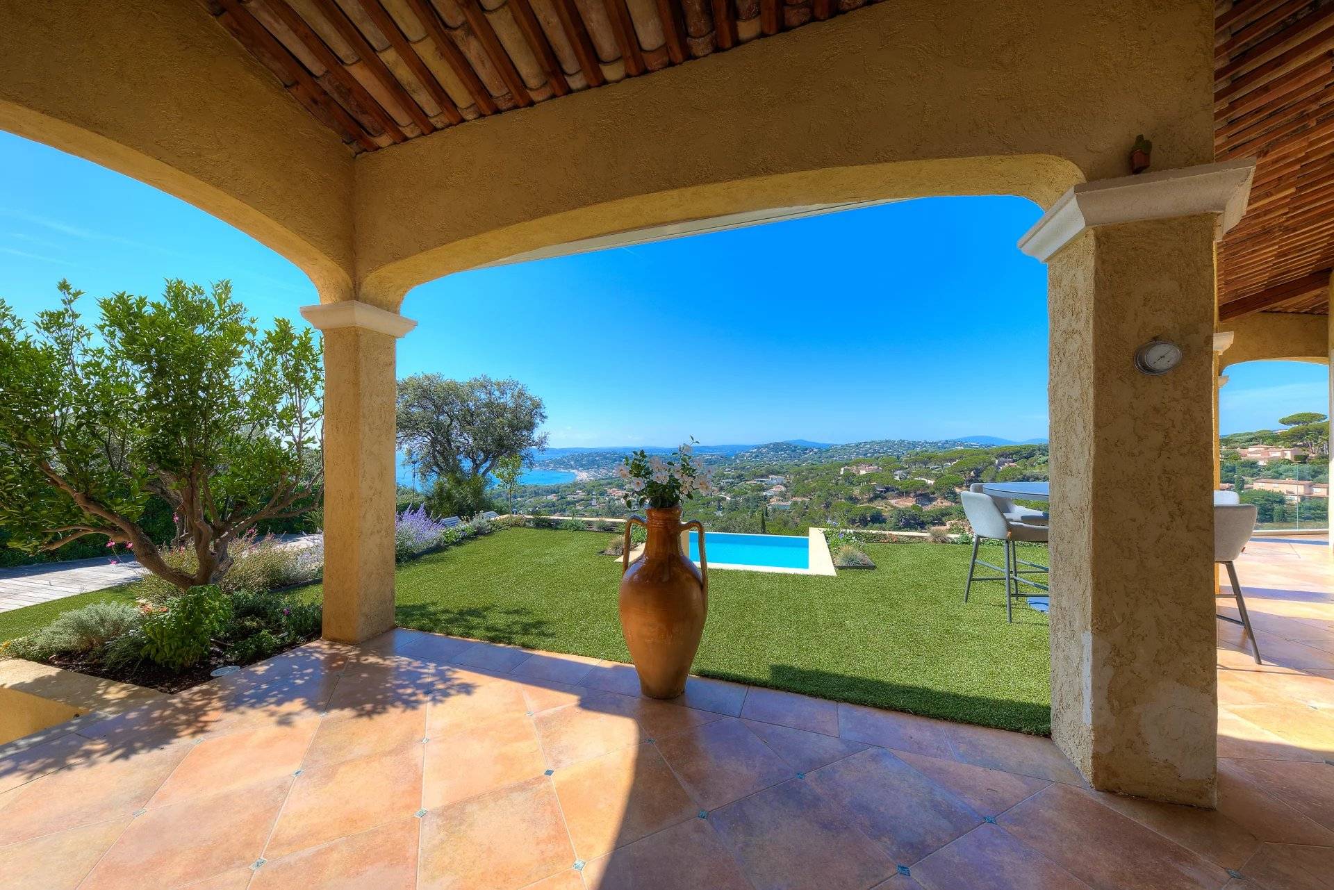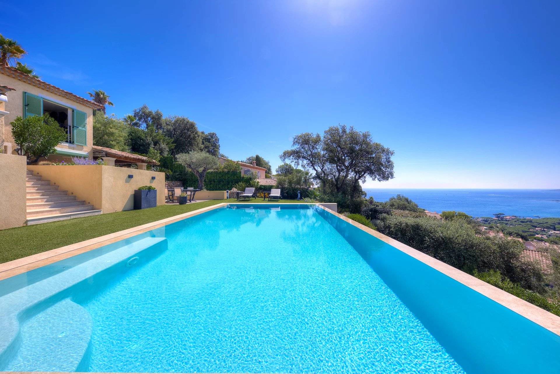 例外的なヴィラ、パノラマ海ビュー。サント・マキシムの高台にある静かなセキュリティ付きのドメインで、2003年に建てられたこの素晴らしいヴィラをぜひご覧ください。家の入り口からは、大きなリビングルームに続き、完全に整備されたアメリカンキッチンがあり、広々としたテラスに面しています。すべてがパノラマ海の景色とプールをどこからでも見ることができるように配置されています。庭の階には、専用のバスルーム、トイレ、プライベートテラスを備えた4つの大きなスイートルームがあります。豪華なワインセラー、ランドリールーム、独立した広いスタジオも付いています。希少な物件で、素晴らしい季節的な賃貸収益があります!