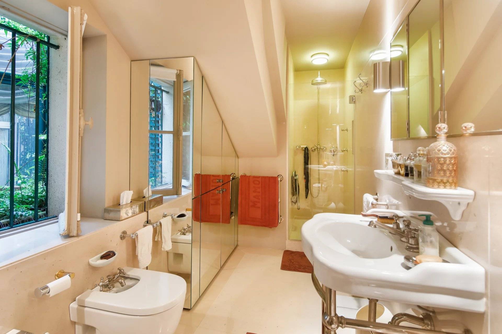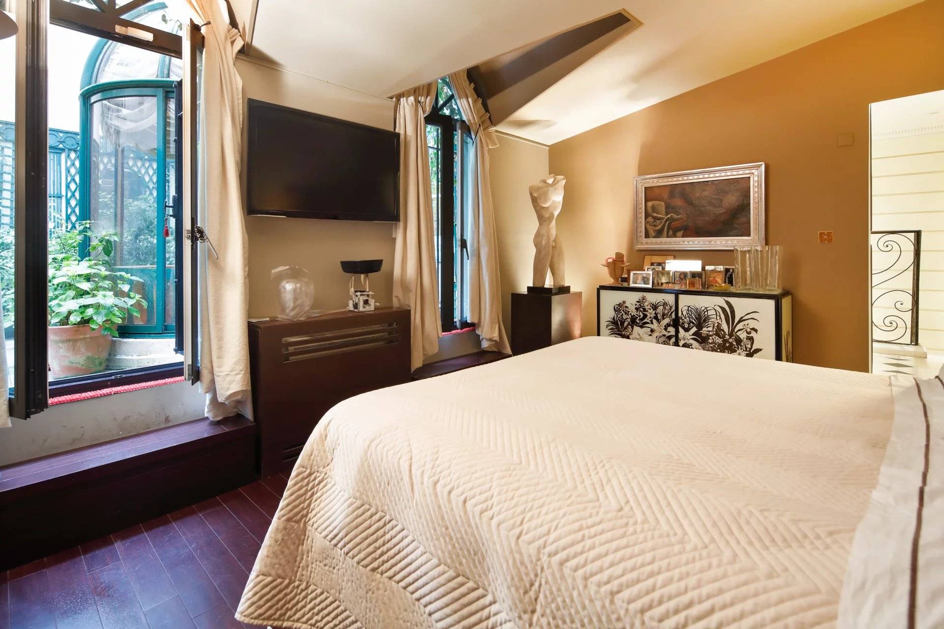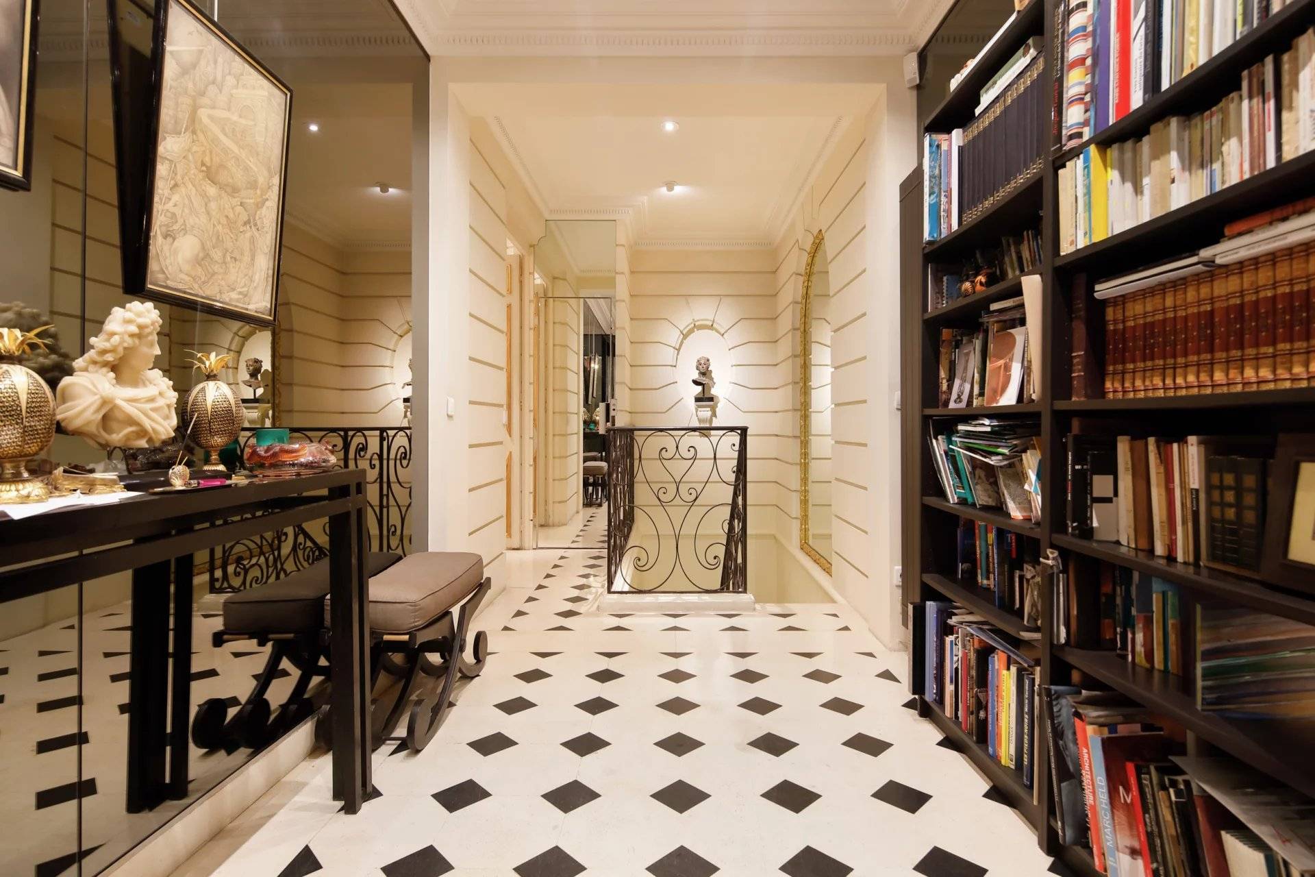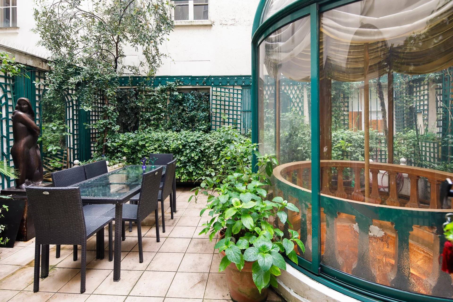 中庭の奥に位置し、美しい階段と専用エレベーターでつながる3階建ての希少な265平方メートルのアパートメントで、18世紀の美しい装飾が施されています。35平方メートルのテラスに面しており、以下の間取りを含みます: